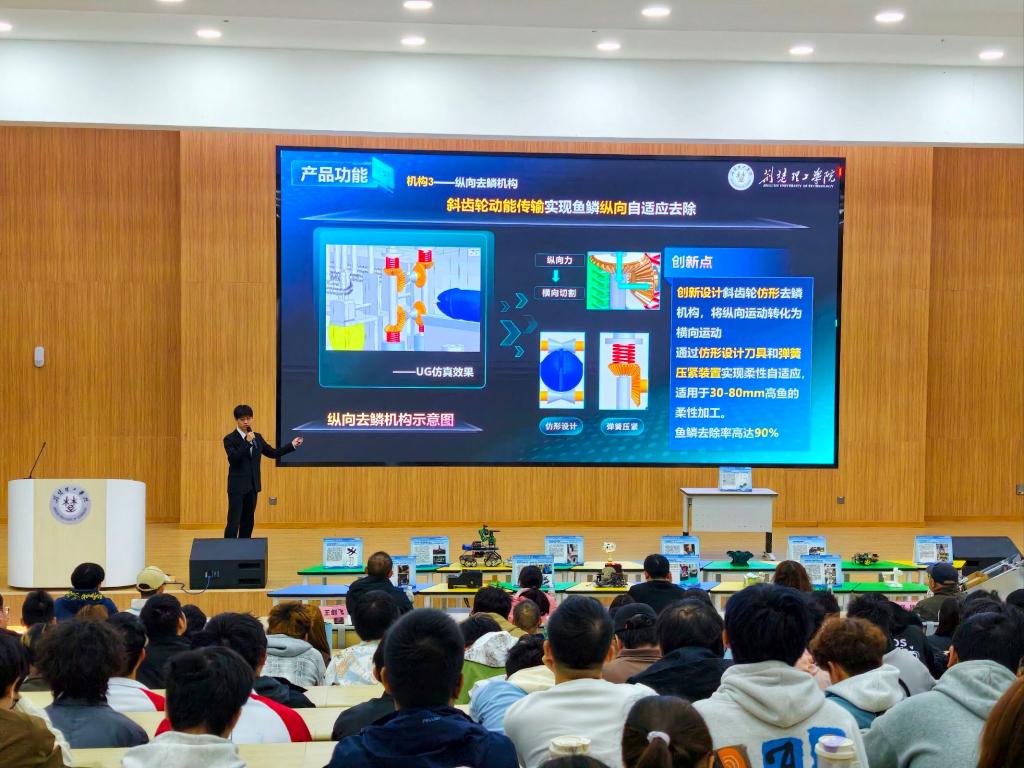 本次发布会作为“一院一品”重点项目,紧扣“实物创作”核心、兼顾虚拟赛道创新,深度响应“中国制造2025”战略,是应用型人才培养的重要展示窗口。文园驿站14件虚拟创意作品涵盖概念设计、技术构想,为实物落地筑牢灵感根基,“多品种淡水鱼加工机”和“仿生壁虎”两项创作方案荣获虚拟赛道一等奖;医学报告厅内300余名师生齐聚,见证9件实体作品亮相。作品覆盖智能装备、绿色制造等关键领域。“太阳能混动空气加湿小车”将太阳能技术成功应用于移动加湿场景,在技术创新与实用价值方面均获得评委一致认可。